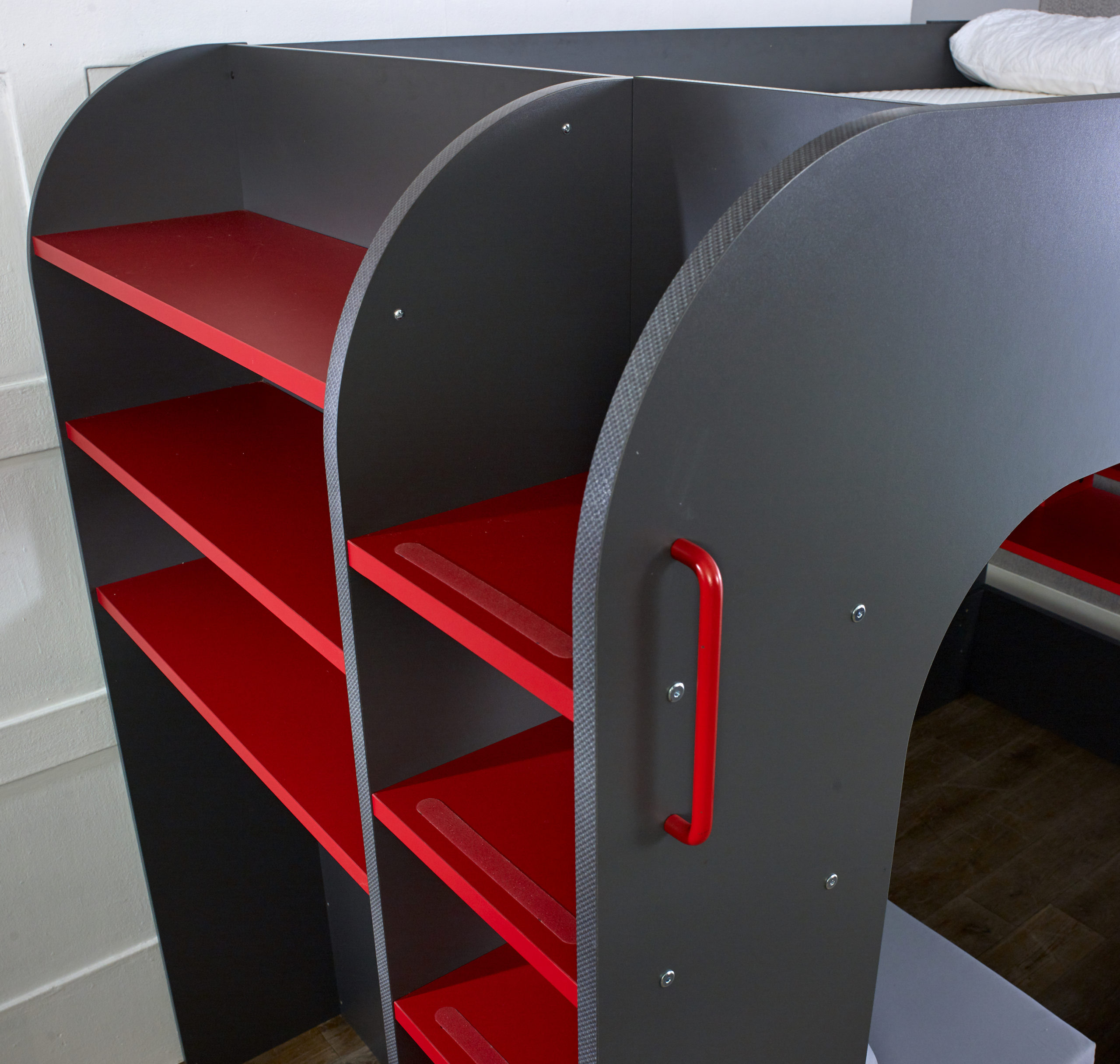 This bed is designed with teenagers in mind, and offers a lounge and sleepover option. The bed has a built-in desk with LED strip lighting the work area, and there is an open robe and shelving at the end of the bed. A ladder provides access to the junior double sleep zone.